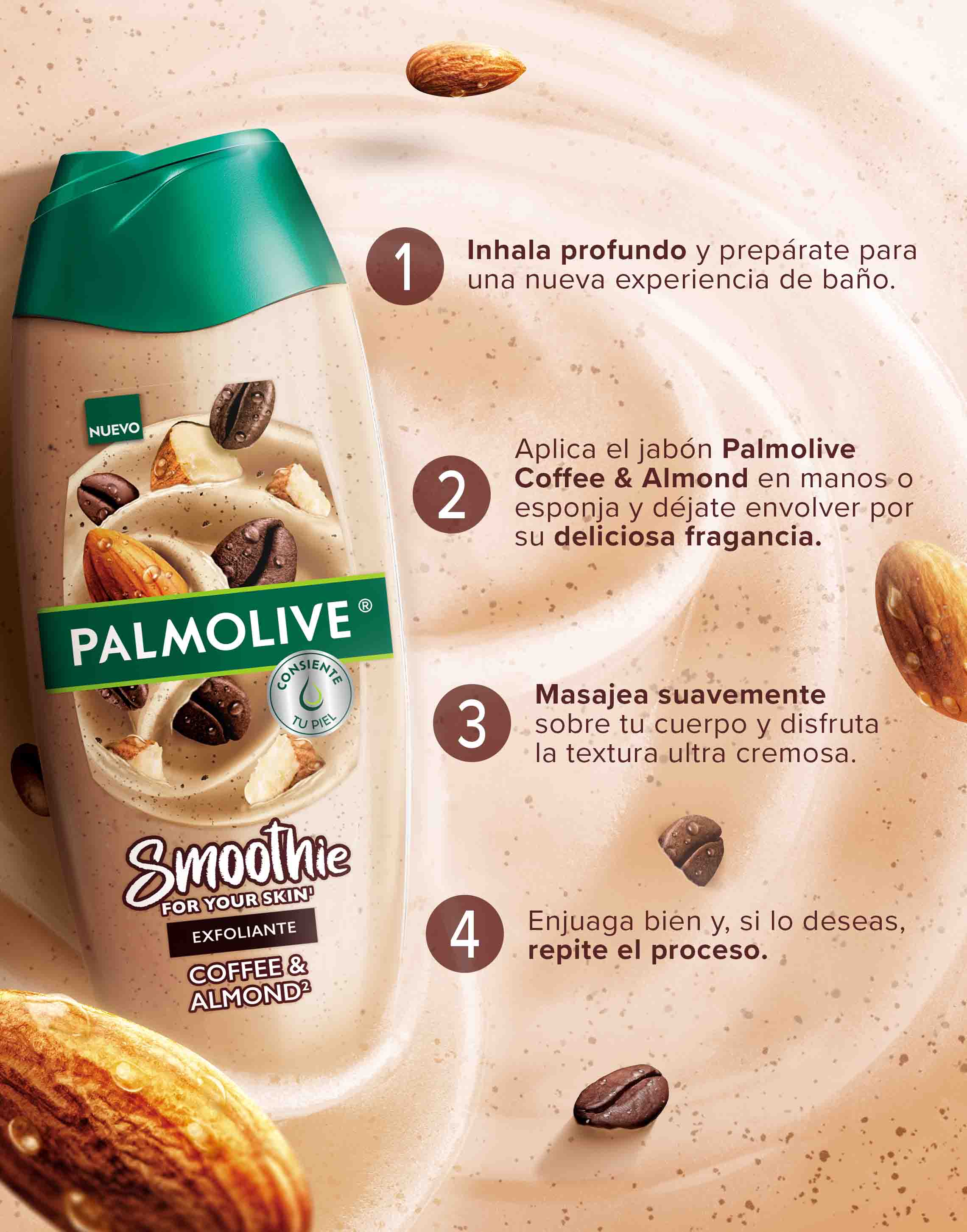 - Empaque frontal del jabón Palmolive Naturals Exfoliación Diaria con extracto de café y aceite de almendra, 100 % ingredientes de origen natural